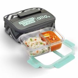 Allo FoodSafe Compartment Glass Lunch Box with Break Free Detachable Lock, 450°C Oven & Microwave Safe, Borosilicate Glass Container with Partition Divider, Office Tiffin with Grey Chevron Bag, 580ml