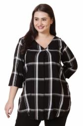 AMYDUS Plus Size V-Neck Rayon Twill Top for Women | Black & White Checkered Print | 32" Length | Centre Pleat Design | Hip-Covering Tunic Style, (Size:- 4XL, Color:- Black)