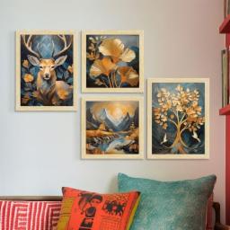 ArtX Paper Golden Deer Sunrise Scenery Flower Tree Art Paintings with Frame for Home Decor, Wall Painting for Living Room, Multicolor, Natural Wood Color Frames, Set of 4