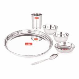 Attro 6 Pieces Smart Stainless Steel Dinnerware/Dinner Set - 1 Thali, 1 D.Plate, 2 Bowl, 1 Glass, 1 Spoon, Kitchen Set for Home, Restaurants, Family - Silver,Solid