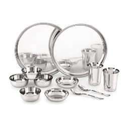 ATTRO Stainless Steel Solid Dinner Set of 2 Thali, 2 Plate, 4 Bowl, 2 Glass, 2 Spoon (Thali Diameter 12 Inch) - Set of 12, Silver, Standard