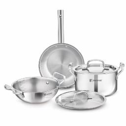 Bergner TriPro 5 Pcs TriPly Stainless Steel Cookware Set of 24cm (3L) Kadai with Lid, 20cm (3.5L) Casserole with Lid/Biryani Pot, 22cm (1.5L) Frypan, Less Oil Use, Healthy Cooking - Induction Bottom