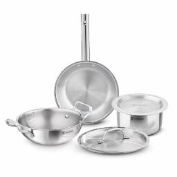 Bergner Tripro Triply Stainless Steel Cook Serve N Keep 5 Pcs Cookware Set - 24cm/3L Kadai with Lid, 22cm/1.5 L Frypan, 16cm/2 L Tope with Lid, Event Heating, Less Oil Use - Induction and Gas Ready