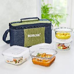 Borosil Ace Universal Borosilicate Glass Lunch Boxes Set of 4 (320 ml, 240 ml) with Lunch Bag, Lunchboxes for Office & College, Microwave Safe, Leak Proof (Green)