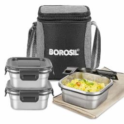 Borosil Feast Stainless Steel Lunch Box with Bag | Set of 3 (400 ml Each), Square | Tiffin Box for Office, School & College
