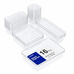 BOXJOY Set of 16 Break Resistant Smart Acrylic Desk Drawers Organisers Transparent Organizer Tray for Office Drawer Dressing Table Makeup Storage Cosmetic Bathroom Dividers and Make Up Plastic Boxes