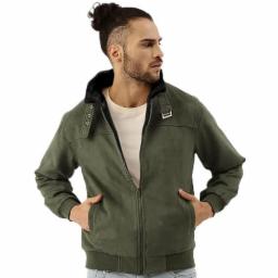 Campus Sutra Men's Army Green Fur-Lined Suede Bomber Jacket | High Neck | Long Sleeve | Zipper Closure | Crafted for Comfort and Casual Everyday Wear