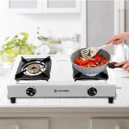 Candes Stainless Steel Gas Stove 2 Burners With Premium Die Cast Alloy Manual Tornado Burner | LPG Compatible | ISI Certified | 1 Yr Warranty | Silver