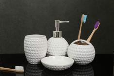 Whizzo Ceramic Honeycomb Shape 4 Pieces Bathroom Set Liquid Dispenser, Toothbrush Holder, Soap Dish, Tumbler Holder (White)