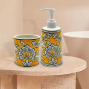 Old Edge Ceramics Hand Painting Bathroom Decor Accessories Set of 2 Liquid Soap Dispenser and Toothbrush Holder (Yellow)