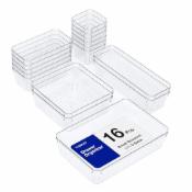 BOXJOY Set of 16 Break Resistant Smart Acrylic Desk Drawers Organisers Transparent Organizer Tray for Office Drawer Dressing Table Makeup Storage Cosmetic Bathroom Dividers and Make Up Plastic Boxes