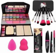 SKINPLUS 7pcs Makeup Brush set with Makeup Kit + 2 pc Blender Puff and 3IN1 (KAJAL+MASCARA+EYELINER) Combo (6 Items in the set)