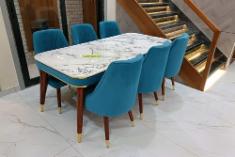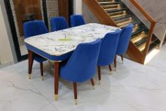 WOODEN SPACE 6-Seater Wooden Dining Table Set | Nano Composite Marble Top | Solid Wood Base | Modern Dining Room Furniture with 6 Chairs (Blue 2)