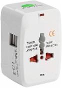 SeCro Plastic Film Universal Travel Adapter with Built in Dual USB Charger Ports with 125V 6A, 250V Surge/Spike Protected Electrical Plug (White) (Style A)