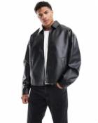 DRIP SPOILER Men's Black Faux Leather Bomber Jacket With Front Zip Closure And Minimal Design For Casual Or Semi Formal Look (Size: XL)