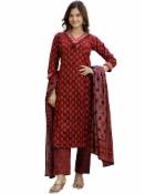 PARTHVI|Women's Pure Cotton Printed With Handwork Kurta with Pants and Dupatta Set | Ethnic Set | Suit Set | Kurta Set | Wedding Suit Set (P-1085-cherry-XL)