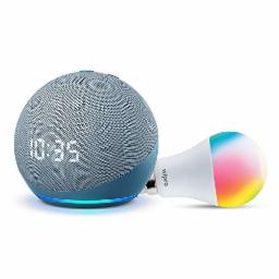 This combo contains Echo Dot (4th Gen) with clock and Wipro 9W LED smart color bulb. Use this bundle to experience the magic of controlling your lights, using just your voice. Control your lights using voice, or control them remotely away from home. Or simply create routine to dim them automatically at night. Only Wi-Fi needed - no additonal hub or setup required!