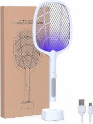 EYUVAA LABEL 2 in 1 Autokill Mosquito Racket Insect Killer Bat with UV Light Lamp, Rechargeable USB Charging Insect Bug Traps Fly Swatter for Indoor, Outdoor, Office, Home (White) (Pack of 1)