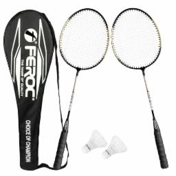 FEROC 5911 Aluminium 2 Pieces Badminton Racket with 2 Pieces Feather Shuttles with Full-Cover Badminton Racquets Complete Sets Kit (Golden)