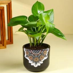 FlowerAura Air Purify Good Luck Money Live Indoor Plant In Black Mandala Terracotta Pot For Gifting, Living Room, Balcony, Kitchen, Home Decor, Office Desk Decor, Window Decor (Same Day Delivery)