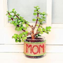 FlowerAura Decorative AirPurifying Green Jade Live Indoor Plant With Jute Wrapped "MOM" Printed Glass Pot Vase Gift's For Mother's Day (Same Day Delivery)