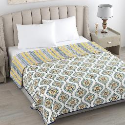 haus & kinder 100% Cotton Reversible Dohar Single Bed, Soft Lightweight Bed Blanket, AC Dohar Blanket for Summers/Winter (Size 56 inch by 88 inch, Blue and Yellow)