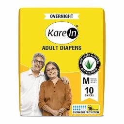KareIn Overnight Adult Diapers, Medium, Waist Size 76-114 Cm (30"- 45"), 10 Count, Tape Style, High Absorbency, Odour Free, With Aloe Vera Lotion, Anti-Bacterial, ADL, Leak Proof, Pack of 1