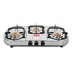Khaitan 3 Burner Double Decker Pro (with Jumbo Brass burner) Stainless Steel | ISI CERTIFIED | Manual Gas Stove (3 Burners)
