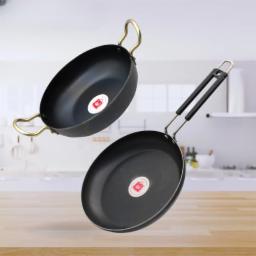 LAZYwindow Traditional Iron Deep Bottom Kadhai & Fry Pan (Induction Base) with Insualted Handle Combo Pack | Easy to Handle & Maintain | (Black)