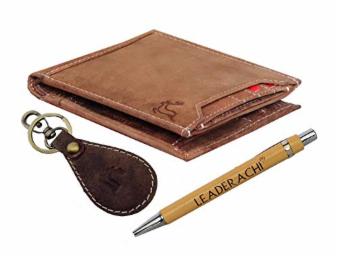 LEADERACHI Genuine Vintage Hunter Leather RFID Blocking Bi fold Wallet with Designer Leather Key Ring & Wooden Pen Combo Gift Box for Mens.(WKP-14)