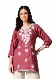 LIBOZA Women's Chikankari Embroidered Short Kurti, Rayon Fabric, Three-Quarter Sleeves, Available in Pink, Black, Mustard Yellow, White, Pista and Green (in, Alpha, M, Regular, Pink)