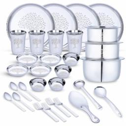 The dinner set has a mirror finish that adds elegance, while the solid construction and rust-proof composition make it ideal for use.
