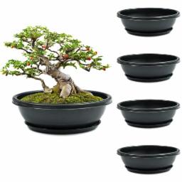 Livzing 15inch Pack of 5 Bonsai Flower Pot with Tray - Virgin Planter Pots with Drain Holes – Indoor Outdoor Balcony Gardening Pots - Oval Shaped Grow Pots for Plants - Black