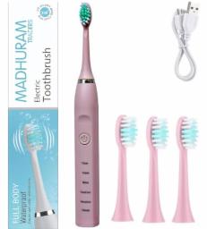 MADHURAM TRADERS ELECTRIC TOOTHBRUSH With 5 Cleaning Modes & Extra 3 Brush Heads For Men, Women & Kids (With USB Charging Cable) (PINK)