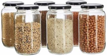 OLAZZO Glass Jar Containers Set of 6 for Kitchen Storage – 1000 ml (1 kg) Each – Airtight Black Lids, BPA-Free, Food Safe – Pantry Storage Jars for Dry Food, Sugar, Snacks & Spices (6)