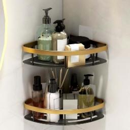 Plantex Bathroom Corner Shelf for Wall/Aluminium Self Adhesive Corner Stand for Kitchen with Golden Railing & Magic Stickers/Bathroom Accessories Items (9x9 inches, Gold & Black) - Pack of 2