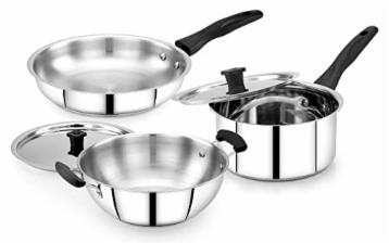 Praylady Stainless Steel Cookware 5 Pcs Set | 16 cm Tea Pan/Sauce Pan with Lid, 22 cm Kadai with Lid, 22cm Fry Pan | Even Heat Distribution | Tight-Fitting Lids | Induction and Dishwasher Safe