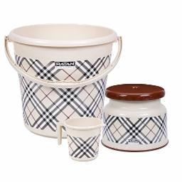 RATAN PLASTICWARE Plastic Bathroom Set of 3 Combo (20L Bucket x 1/1.5L Mug x 1 / Nova Patla Stool 107 x 1) Bath Sets Home, Hotels, Hostel, Hospital Frosty Checks Print - Beige