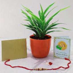 Rolling Nature Rakhi Combo of Good Luck Air Purifying Live Chlorophytum Spider Plant in Orange Round Colorista Plastic Pot | Rakshabandhan Gifts | Natural Plants
