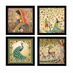 Rousrie Madhubani Art Framed Painting For Home, Living Room, Hall | Traditional Rajasthani Pichwai Art Paitnings With Frame For Home Decor (Set Of 4)