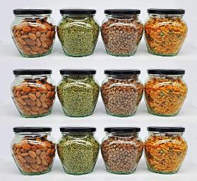SITOVI Transparent Glass Jar and Container Air Tight Black Lid for Kitchen 400 ml Mataki Glass Jar with Airtight Metal Lid Pack of (12)