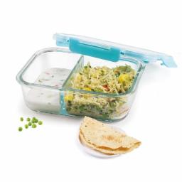 Treo by Milton Hi Borosilicate Clip Fresh Rectangular Divider Container, Microwave Oven Safe Glass Tiffin Box with Air Tight Lid, 2 Multipurpose Storage Compartments, 1000ml, Transparent