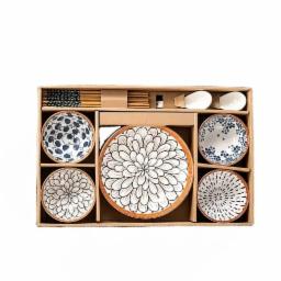 VATSHVI 14 Pieces Dinnerware Set, Ceramic Kitchen Floral Dinner Set, Quality Porcelain, Dishwasher Safe, Japanese Style, Apply To Soup, Pasta, Salad, (2 Plate+ 4 Bowl+ 4 Soup Spoon+ 4 Set Chop Stick)