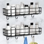 Shynora 2-Pack Self Adhesive Bathroom Kitchen Storage Shelf Rack Wall Mounted Bathroom Accessories with 4-Towel Holder Hooks with Black Matt Finish Stainless Steel (Black), Floating Shelves